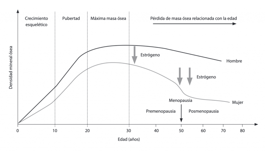 Un aspecto importante es que las mujeres inician el proceso de pérdida de masa ósea antes que los hombres debido a la menopausia, en la cual se produce una menor cantidad de estrógenos.